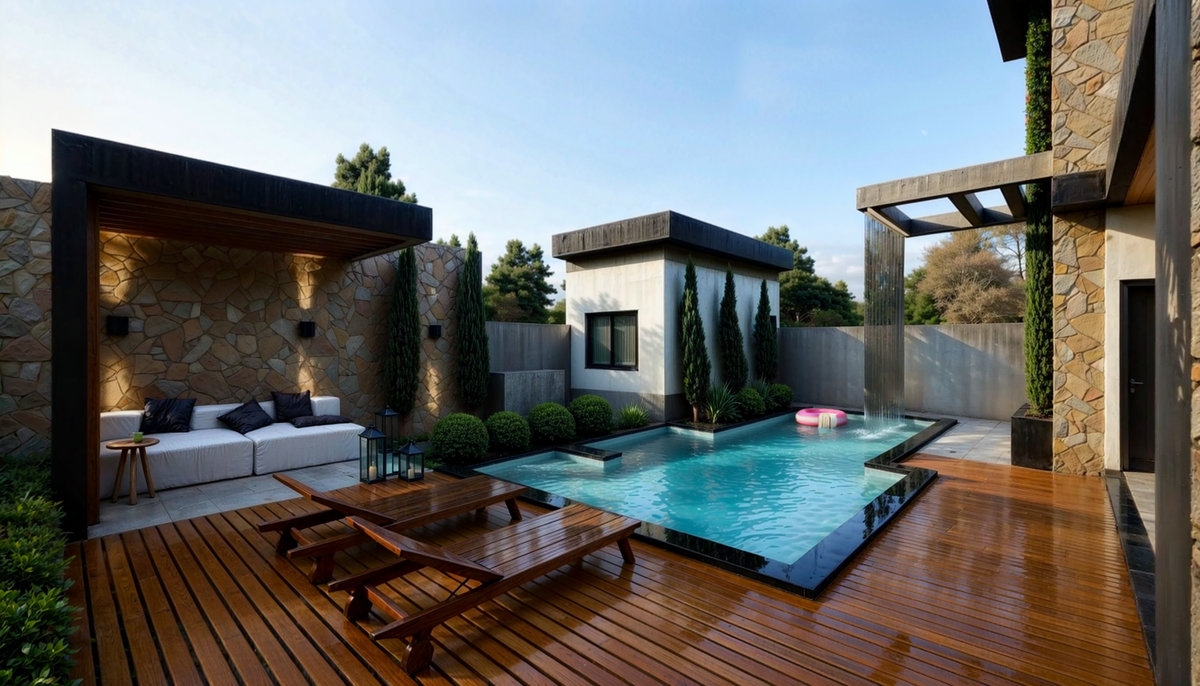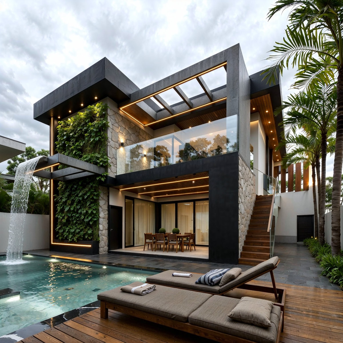 Os espaços externos valorizam o lazer, com piscina em pedra natural, cascata arquitetônica, lounge e área gourmet integrados ao paisagismo tropical.