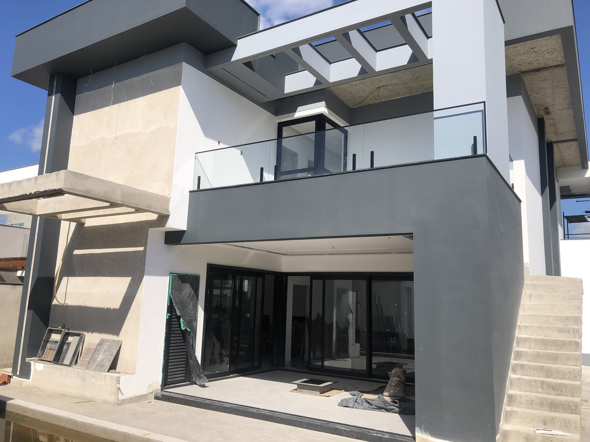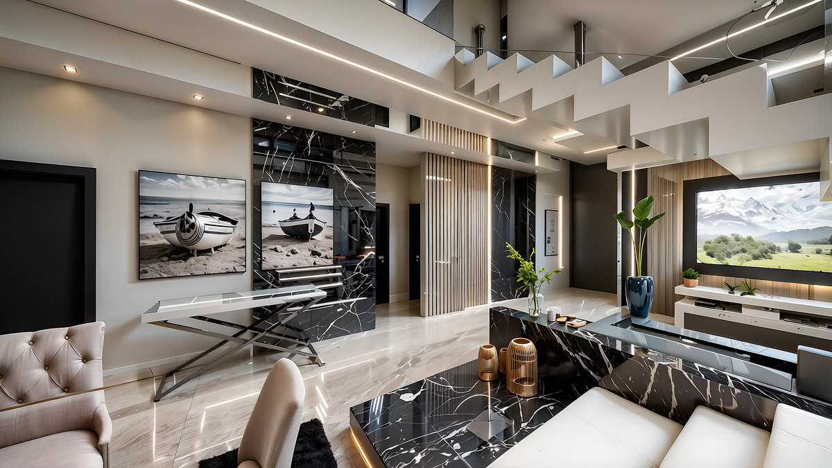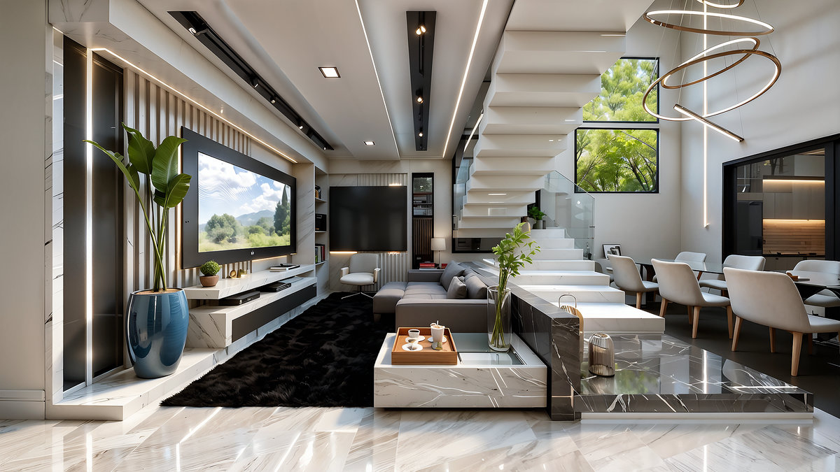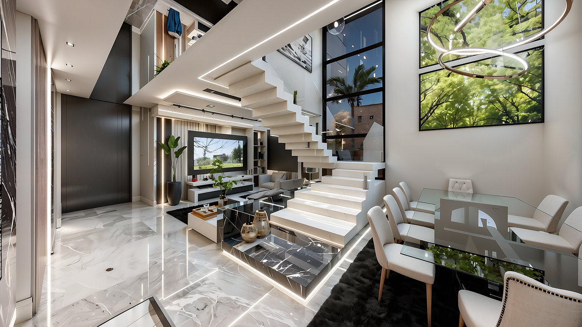 Internamente, pé-direito duplo, escada escultural e grandes aberturas trazem amplitude e luz natural. Materiais nobres, como mármore e painéis amadeirados, reforçam a sensação de refinamento, enquanto a suíte master apresenta um design acolhedor e funcional.